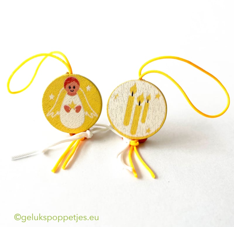 Geluksengeltje mit Kaarsjes, ein eigentümliches Gelukspoppetje von nur 25 mm Doornee. Auf einer Seite des Gelukshangertje befanden sich ein Geluksengeltje und auf dem anderen Rand des Gelukshangertje seit 3 Monaten.