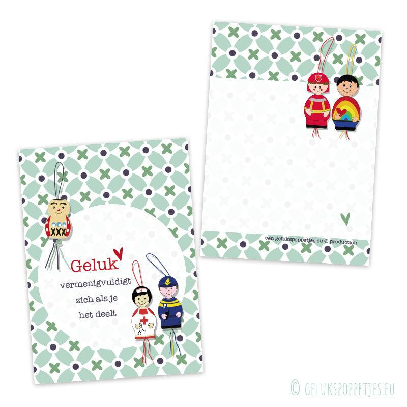 „Geluk vermenigvuldigt zich as je het deelt“ ist ein Gelukskaartje mit den Afbeeldingen der letzten Gelukspoppetjes, die wir in einer Sammlung hebben!