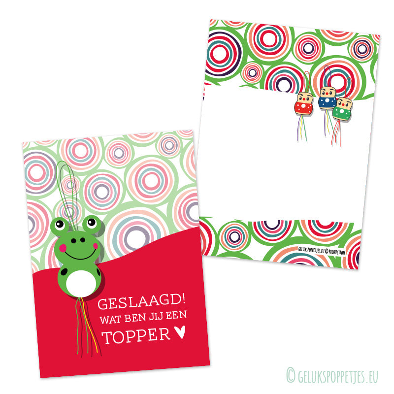 „GESLAAGD“ Gelatine im Format 10,5 x 7,4 cm, gedruckt auf 300 Gramm Papier. Eine leere Karte mit der Abbildung des angezeigten Bildes auf dem Hintergrund der Abbildung der oberen Abbildungen. Leuk om es a van de gelukspoppetjes ook bij te order!