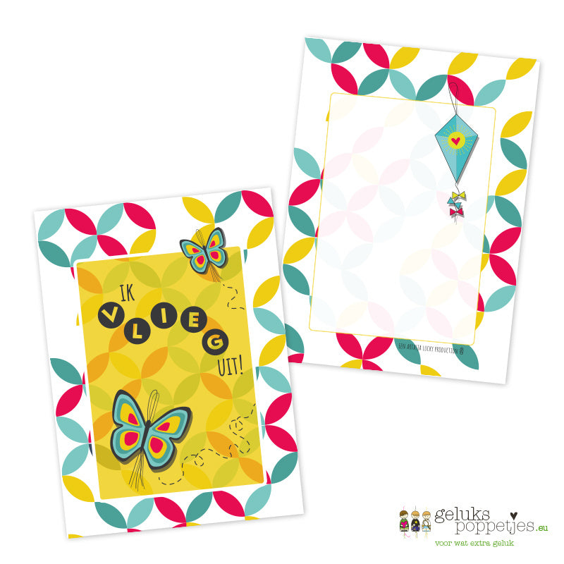 Gelukskaartje met afbeelding van onze geluksvlinder. Diese Person fliegt uit naar.....