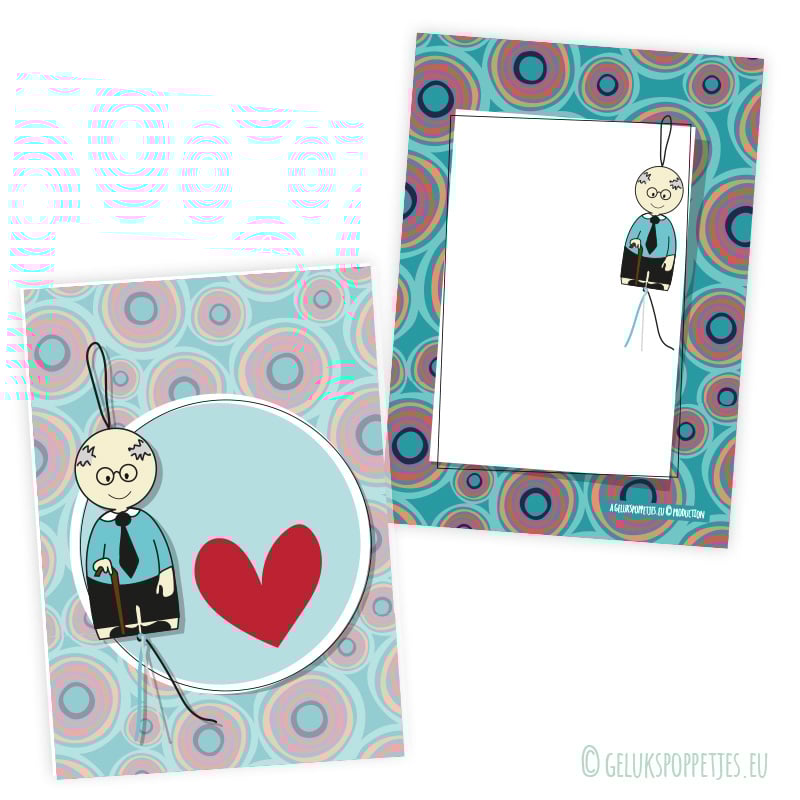 Opa gelukspoppetjes Karte im Retro-Stil. Das Papier ist nur 10,5 x 7,4 cm groß und 300 Gramm schwer.