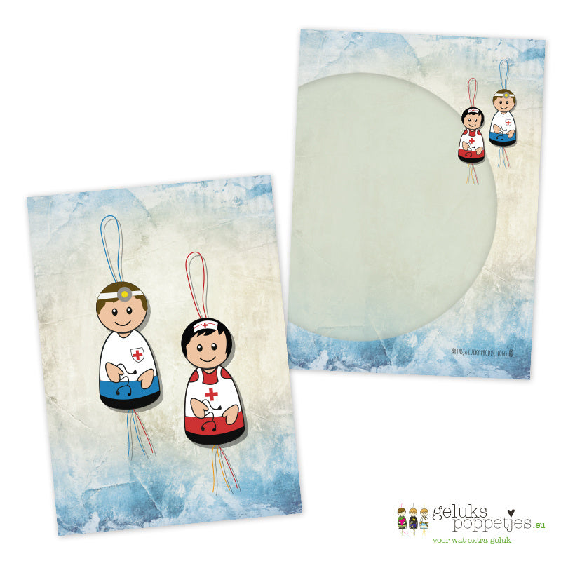 Viele Karten mit den Gelukspoppetjes des vervollständigten Personals auf dem Bild. Der Gerichtsmediziner und der Verpleegkundige, der Erste oder der Verpleegster. Das Hauspersonal muss sich darüber im Klaren sein, dass es sich um eine Karte handelt, um Ihnen zu danken, aber es ist auch eine leere Karte für eine Frau mit der Brust, die der Arzt und die Tochter gut für sich haben.