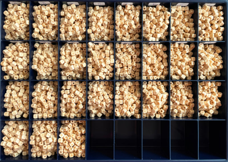 Houten Letterkralen gemanagt von FSC Hout. Diese Buchstaben sind nur 6 x 6 mm groß und haben einen Durchmesser von 1 mm. Diese Briefmarken wurden speziell für Artasja Lucky Productions® erstellt und bedrängt, dass sie sich sofort auf den Weg machen.